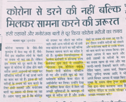 कुरुक्षेत्र के स्टेट बेस्ट यूथ अवार्डी हरिकेश पपोसा ने जीती कोरोना की जंग ओर कहा इस बीमारी से डरने की जरूरत नही बल्कि मिलकर सामना करने की जरूरत है