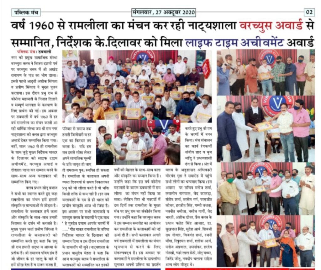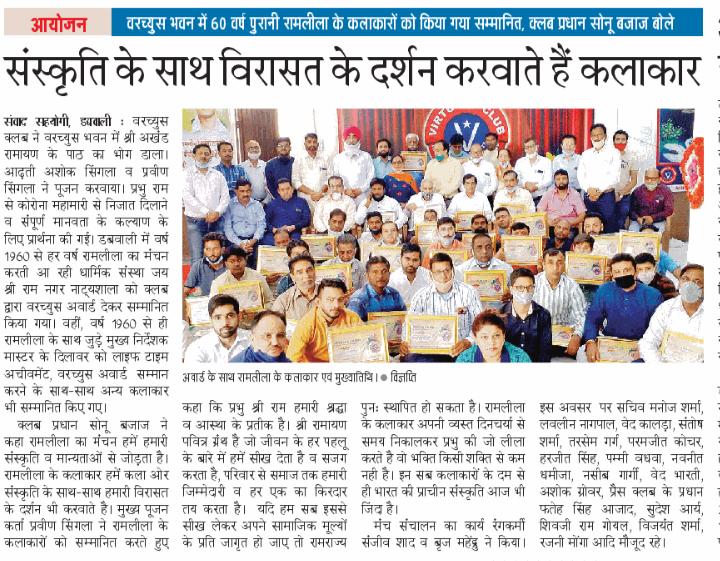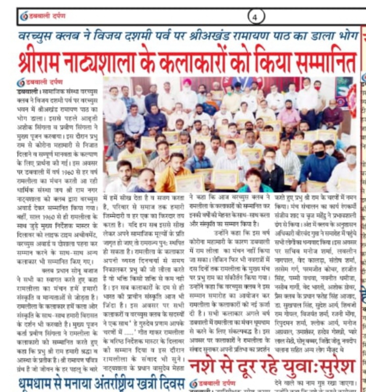 वरच्युस क्लब ने विजय दशमी पर्व पर वरच्युस भवन में श्री अखंड रामायण के पाठ का भोग डाला। इससे पहले आढ़ती अशोक सिंगला व प्रवीण सिंगला ने मुख्य पूजन करवाया। इस दौरान प्रभु राम से कोरोना महामारी से निजात दिलाने व सम्पूर्ण मानवता के कल्याण के लिए प्रार्थना की गई। इस अवसर पर डबवाली में वर्ष 1960 से हर वर्ष रामलीला का मंचन करती आ रही धार्मिक संस्था जय श्री राम नगर नाट्यशाला को क्लब द्वारा वरच्युस अवार्ड देकर सम्मानित किया गया। वहीं, साल 1960 से ही रामलीला के साथ जुड़े मुख्य निर्देशक मास्टर के दिलावर को लाइफ टाइम अचीवमेंट, वरच्युस अवार्ड व दोशाला पहना कर सम्मान करने के साथ-साथ अन्य कलाकार भी सम्मानित किए गए।