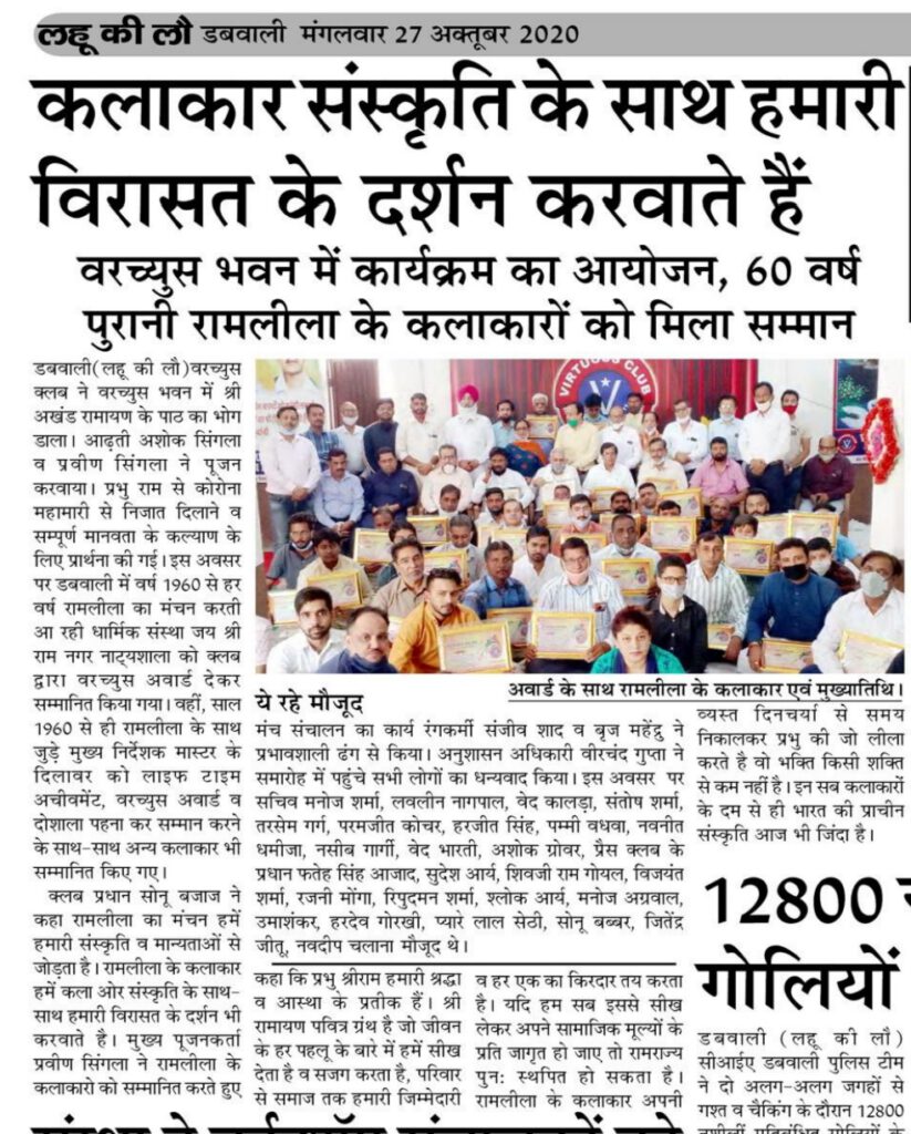नाट्यशाला के प्रधान वासुदेव मेहता ने कहा कि आज वरच्युस क्लब ने रामलीला के कलाकारों को सम्मानित कर इनकी वर्षों की मेहनत के साथ-साथ कला और संस्कृति का सम्मान किया है। उन्होंने कहा कि इस वर्ष कोरोना महामारी के कारण डबवाली में राम लीला का मंचन नहीं किया जा सका। लेकिन फिर भी नवरात्रों में दस दिनों तक रामलीला के मुख्य मंच पर प्रभु राम का संकीर्तन किया गया। उन्होंने कहा कि वरच्युस क्लब ने इस सम्मान समारोह का आयोजन कर रामलीला के कलाकारों को नई ऊर्जा दी है। सभी कलाकार अगले वर्ष डबवाली में रामलीला का मंचन धूमधाम से करने के लिए संकल्पबद्ध है। इस अवसर पर कलाकारों ने रामलीला के डायलॉग्स सुनाकर अपनी प्रतिभा का प्रदर्शन करते हुए प्रभु श्री राम के चरणों में नमन किया। मंच संचालन का कार्य रंगकर्मी संजीव शाद व बृज महेंद्रु ने प्रभावशाली ढंग से किया। अंत में क्लब के अनुशासन अधिकारी वीरचंद गुप्ता ने समारोह में पहुंचे सभी लोगों का धन्यवाद किया। इस अवसर पर सचिव मनोज शर्मा, लवलीन नागपाल, वेद कालड़ा, संतोष शर्मा, तरसेम गर्ग, परमजीत कोचर, हरजीत सिंह, पम्मी वधवा, नवनीत धमीजा, नसीब गार्गी, वेद भारती, अशोक ग्रोवर, प्रैस क्लब के प्रधान फतेह सिंह आजाद, डा. सुखपाल सिंह, सुदेश आर्य, शिवजी राम गोयल, विजयंत शर्मा, रजनी मोंगा, रिपुदमन शर्मा, श्लोक आर्य, मनोज अग्रवाल, उमाशंकर, हरदेव गोरखी, प्यारे लाल सेठी, सोनू बब्बर, जितेंद्र जीतू, नवदीप चलाना सहित अन्य लोग मौजूद थे।