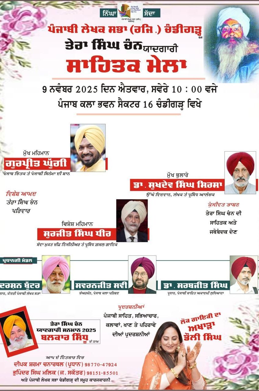 पंजाबी लेखक सभा चंडीगढ़ की तरफ़ से सभा के संस्थापक तेरा सिंह चन्न की याद को समर्पित साहित्यिक मेला इस रविवार 9 नवंबर को पंजाब कला भवन चंडीगढ़ के प्रांगण में सुबह दस बजे लगाया जा रहा है |