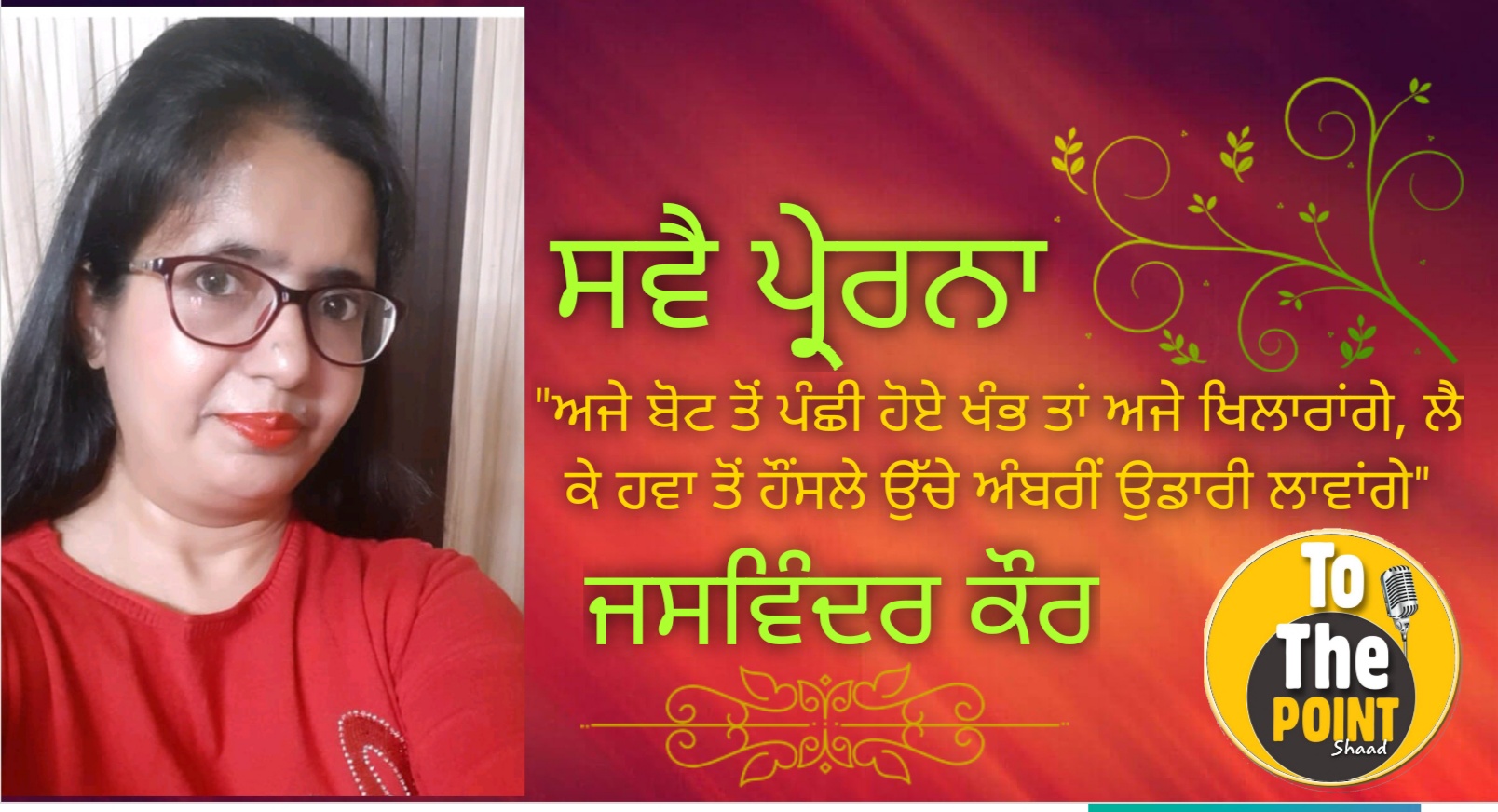 ਸਵੈ ਪ੍ਰੇਰਨਾ“ਅਜੇ ਬੋਟ ਤੋਂ ਪੰਛੀ ਹੋਏ ਖੰਭ ਤਾਂ ਅਜੇ ਖਿਲਾਰਾਂਗੇ,ਲੈ ਕੇ ਹਵਾ ਤੋਂ ਹੌੰਸਲੇ ਉੱਚੇ ਅੰਬਰੀਂ ਉਡਾਰੀ ਲਾਵਾਂਗੇ”ਜੇਕਰ ਬੰਦੇ ਅੰਦਰ ‘ਸਵੈ ਵਿਸ਼ਵਾਸ’ ਦਾ ਬੀਜ ਹੈ ਤੇ ਉਹ ਇਸ ਨੂੰ ‘ਸਵੈ ਪ੍ਰੇਰਨਾ’ ਦਾ ਪਾਣੀ ਵੀ ਦਿੰਦਾ ਹੈ ਤਾਂ ਉਹਦੇ ਅੰਦਰ ‘ਜ਼ਿੰਦਾਦਿਲੀ’ ਦੇ ਫੁੱਲ ਜ਼ਰੂਰ ਖਿੜਦੇ ਨੇ !ਸਵੈ ਪ੍ਰੇਰਨਾ ਏ ਸਾਡੇ ਆਪਣੇ ਅੰਦਰ ਦੇ ਜਜ਼ਬੇ ਤੇ ਜਨੂੰਨ ਦੀ ਆਵਾਜ਼ ਇਹ ਆਵਾਜ਼ ਜਦ …
